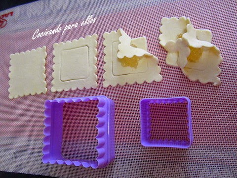 Extendemos la lamina de hojaldre y con dos cortadores uno mas grande y otro mas pequeño vamos cortando el hojaldre según veis en las fotos.