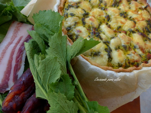 Quería elegir un título para este pastel o torta que no fuera un título francés ya que es una quiché totalmente gallega con los ingredientes propios de mi tierra, los grelos que es la verdura que mas me gusta sin dudarlo, el chorizo de carne un manjar de dioses y el queso tetilla uno de los quesos mas ricos y mantecosos..acompañados con unos pequeños trocitos de panceta.